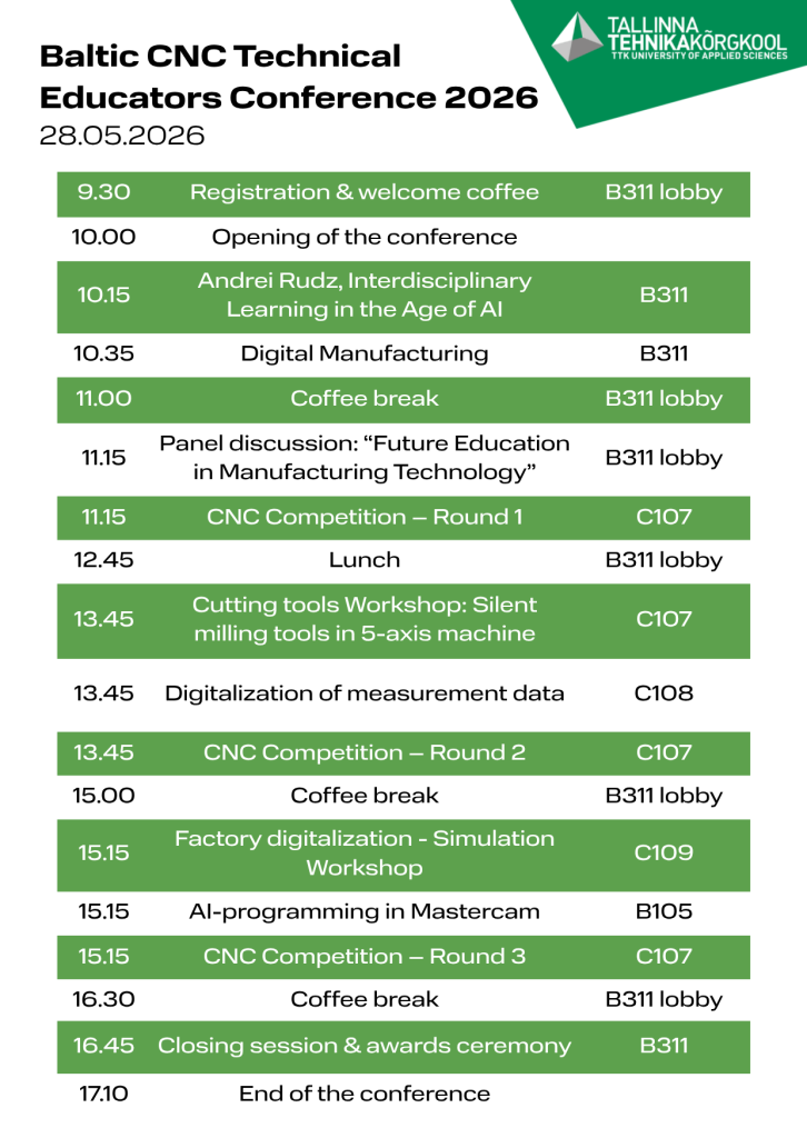 The Institute of Technology at TTK University of Applied Sciences invites you to participate in the Baltic CNC Technical Educators Conference 2026, which brings together CNC field educators and equipment distributors.