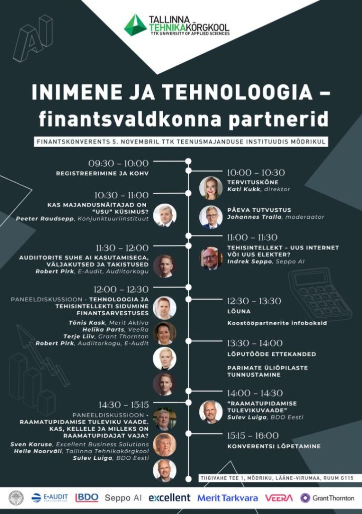 Päevakava algab Konjunktuuriinstituudi majandusülevaatega, millele järgneb arutelu, kas tehisintellekt on uus internet või koguni uus elekter. Eesti Audiitorkogu esindaja annab ülevaate AI kasutamise võimalustest ja takistustest audiitorite töös.